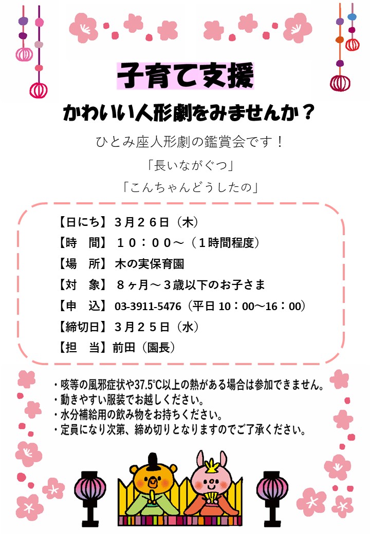 木の実保育園では、毎月、地域にお住まいの8カ月から3歳以下のお子さまを対象に子育て支援を行っています。木の実保育園の子どもたちと一緒に保育体験をしたり、希望者に向けて育児相談や身長・体重測定も行っていますので、お気軽にご連絡ください。