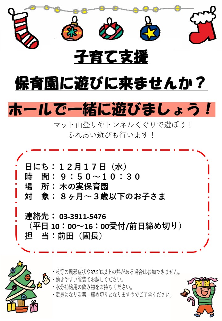 木の実保育園では、毎月、地域にお住まいの8カ月から3歳以下のお子さまを対象に子育て支援を行っています。木の実保育園の子どもたちと一緒に保育体験をしたり、希望者に向けて育児相談や身長・体重測定も行っていますので、お気軽にご連絡ください。